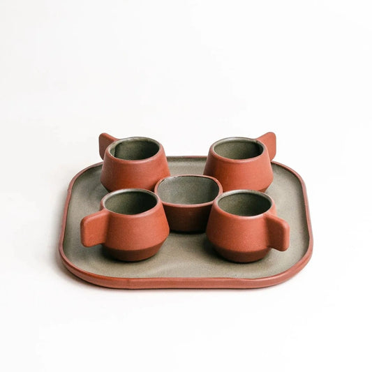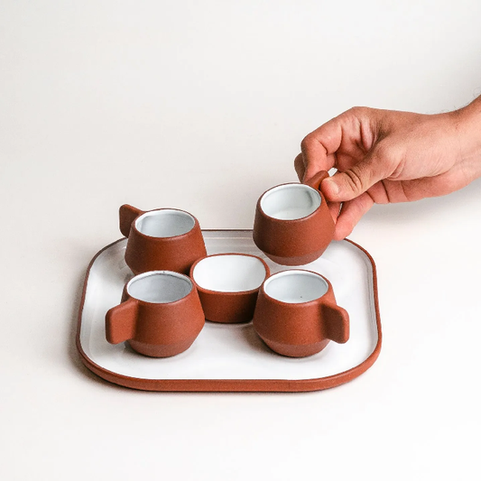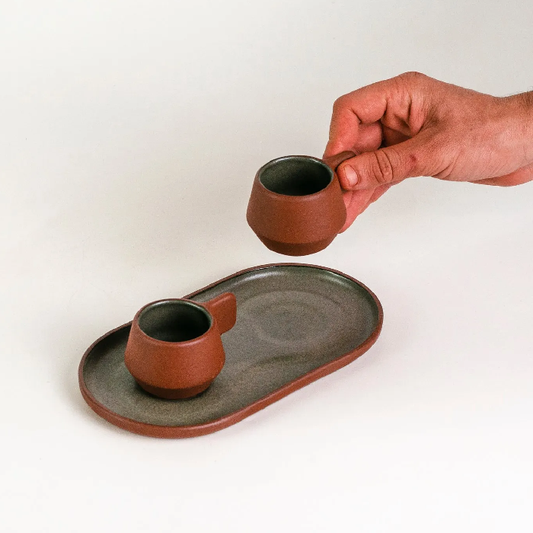 Preço normal R$ 239,00Preço normalPreço unitário / porR$ 239,00Preço promocional R$ 239,00O Conjunto foi feito para ficar naquele espaço do café, junto da máquina de café expresso ou dos utensílios, pronto para servir e compartilhar um cafézinho delicioso. Um jeito bonito e prático de armazenar as xícaras. Contém: 2 Mini Xícaras (80 ml) 1 Bandeja com encaixe para 2 Mini Xícaras Medidas Aproximadas: 23 x 13 x 6 cm Cor: Terracota e Cinza Escuro Todos os produtos são produzidos artesanalmente, portanto é normal ocorrerem variações nas cores, formato e textura. Isso faz parte do processo e torna cada peça única. As fotos são de produtos reais porém não são eles mesmos que serão enviados. Código: 80657Esgotado -