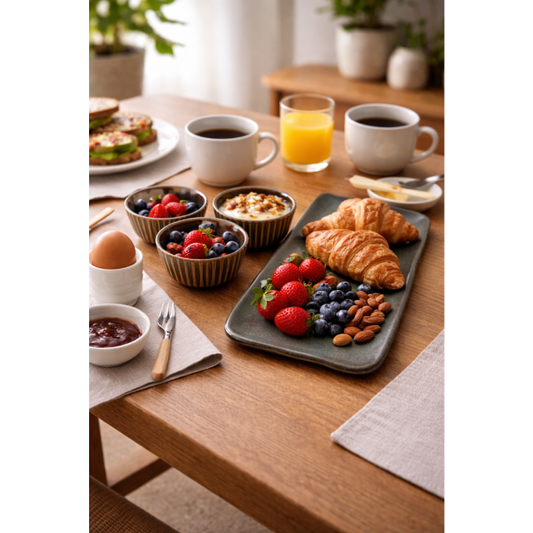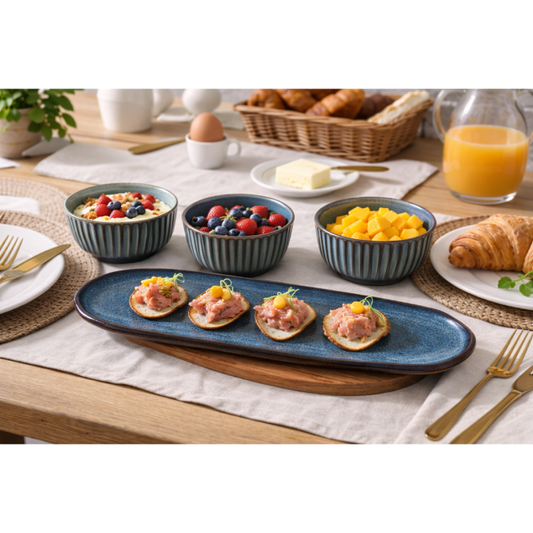 Preço normal R$ 199,00Preço normalPreço unitário / porR$ 199,00Preço promocional R$ 199,00Conjunto em cerâmica ideal para servir petiscos, molhos, castanhas ou pequenas porções com elegância. Com design moderno e acabamento texturizado, é perfeito para compor uma mesa posta prática e sofisticada. Contém: • 3 bowls – 4,5 × Ø 9 cm (cada) • 1 travessa – A: 2 × P: 12,5 × C: 36 cm Por se tratar de uma peça com processo artesanal, pode apresentar leves variações de cor, forma e textura, características que garantem sua exclusividade e autenticidade. As fotos dos produtos podem ter pequenas variações de cor comparadas ao produto original. Código: 14661402 -