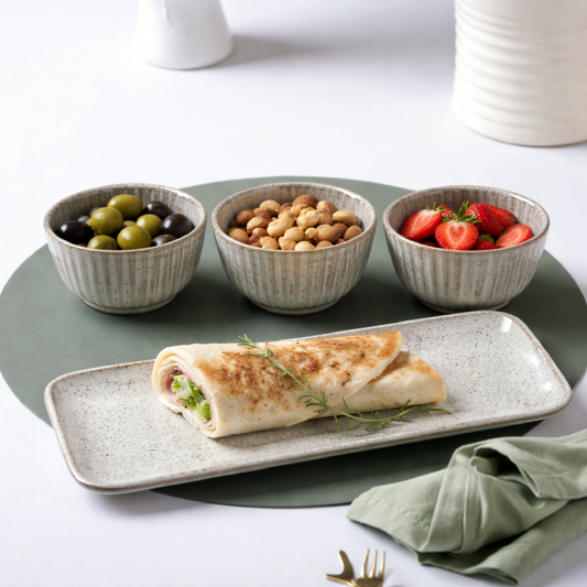 Preço normal R$ 199,00Preço normalPreço unitário / porR$ 195,00Preço promocional R$ 199,00Conjunto em cerâmica ideal para servir petiscos, molhos, castanhas ou pequenas porções com elegância. Com design moderno e acabamento texturizado, é perfeito para compor uma mesa posta prática e sofisticada. Contém: 3 bowls – 4,5 × Ø 9 cm (cada) 1 travessa – A: 2 × P: 12,5 × C: 33 cm Por se tratar de uma peça com processo artesanal, pode apresentar leves variações de cor, forma e textura, características que garantem sua exclusividade e autenticidade. As fotos dos produtos podem ter pequenas variações de cor comparadas ao produto original. Código: 14661401 -