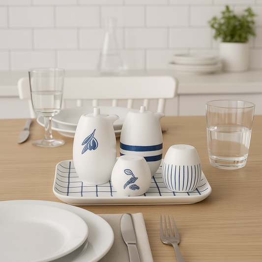Preço normal R$ 389,00Preço normalPreço unitário / porR$ 389,00Preço promocional R$ 389,00Conjunto elegante e funcional com 5 peças de porcelana: ideal para servir azeite, vinagre, sal, pimenta e molhos com charme. Estampa azul delicada que combina com qualquer mesa ou cozinha. Design moderno e minimalista Cerâmica de alta qualidade Perfeito para uso diário ou para receber visitas Contém: 1 bandeja + 2 galheteiros + 2 potinhos (saleiro e pimenteiro) Medidas aproximadas: 17cm x 17cm As fotos dos produtos podem conter pequenas variações de cor comparadas ao produto original. Código:808704Esgotado -