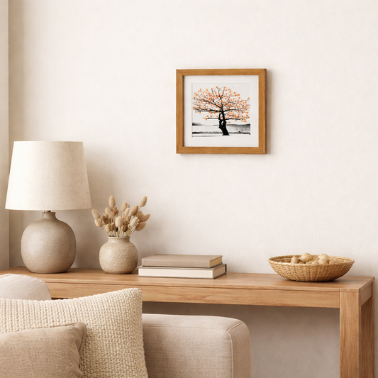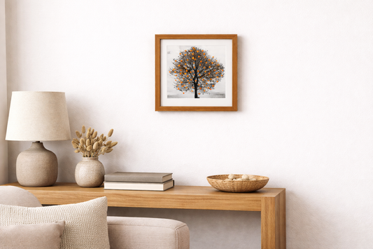 Preço normal R$ 750,00Preço normalPreço unitário / porR$ 750,00Preço promocional R$ 750,00Essa obra emoldurada apresenta a imagem de uma árvore em preto e branco, cuja copa é delicadamente transformada por bordados à mão em tom laranja, criando pontos de cor que evocam flores, frutos e renovação. O contraste entre a fotografia e o bordado manual traz textura, movimento e profundidade à composição. A moldura em madeira clara acrescenta um acabamento elegante e acolhedor, valorizando a obra e destacando seus detalhes com leveza. A união entre o rigor da imagem e a suavidade do bordado cria um diálogo sensível entre natureza, tempo e gesto artístico. Com estética contemporânea e poética, esta peça é ideal para ambientes que buscam arte autoral, equilíbrio visual e um toque de cor sutil, tornando-se um destaque delicado e expressivo no espaço. Tamanho aproximado:21x21 Artista: Patricia Saraiva Observação: Cada obra é produzida artesanalmente, o que torna cada peça única. Pequenas variações e leves imperfeições fazem parte do processo artístico e do material. As fotos dos produtos podem ter pequenas variações de cor comparadas ao produto original. Código:900082 -