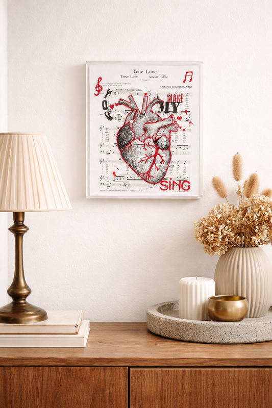 Preço normal R$ 1.035,00Preço normalPreço unitário / porR$ 1.035,00Preço promocional R$ 1.035,00Essa obra em acrílico apresenta a imagem de um coração anatômico sobre uma partitura musical clássica, criando um encontro expressivo entre arte, musica e emoção. O destaque está nos bordados à mão em linhas vermelhas, que desenham veias, contornos e símbolos, trazendo intensidade, textura e vida à composição. As palavras e elementos gráficos, como notas musicais e corações, reforçam a ideia de sentimento em voz alta, emoção que pulsa e se expressa — como um coração que canta. O contraste entre a base impressa da partitura, o desenho do coração e o bordado manual cria profundidade e um forte impacto visual. A transparência do acrílico valoriza a obra, proporcionando leveza e um jogo sutil de luz e sombra. Com estética contemporânea e poética, esta peça é ideal para ambientes criativos, musicais ou afetivos, trazendo personalidade, sensibilidade e significado ao espaço. Tamanho: 20x25cm Artista: Patricia Saraiva As fotos dos produtos podem ter pequenas variações de cor comparadas ao produto original. Código:TR505 -