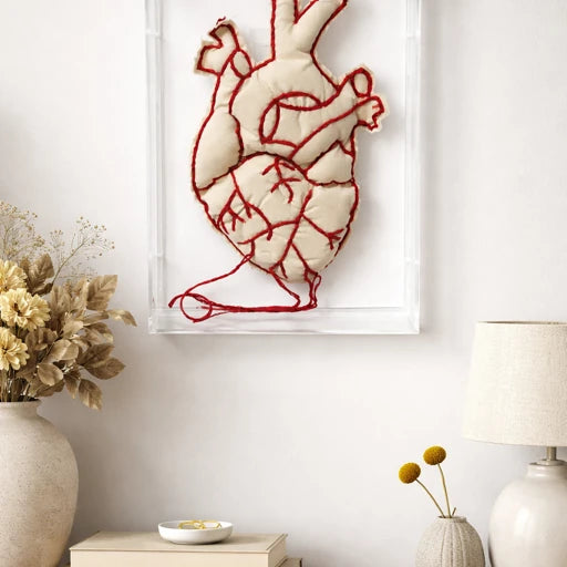 Preço normal R$ 1.035,00Preço normalPreço unitário / porR$ 1.035,00Preço promocional R$ 1.035,00Essa obra em acrílico apresenta um coração anatômico tridimensional, confeccionado em tecido e bordado à mão com linhas vermelhas, que desenham veias e contornos de forma expressiva. O bordado evidencia o gesto manual e transforma o coração em um objeto sensível, pulsante e carregado de significado. O contraste entre a suavidade do tecido, a intensidade da linha vermelha e a transparência do acrílico cria profundidade e impacto visual, dando a sensação de suspensão e destaque no espaço. Os fios aparentes reforçam a ideia de continuidade, conexão e emoção em fluxo. Com estética contemporânea e poética, esta peça é ideal para ambientes que buscam arte autoral, afeto e força simbólica, tornando-se um ponto focal marcante e sensível. Tamanho: 20x30cm Artista: Patricia Saraiva As fotos dos produtos podem ter pequenas variações de cor comparadas ao produto original. Código:2000000000301 -
