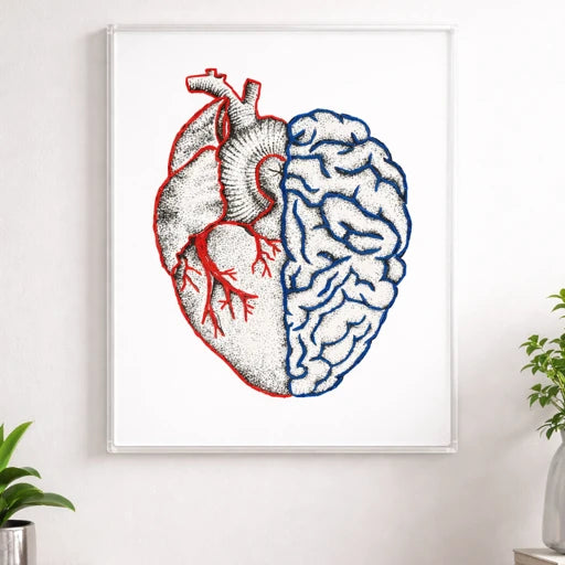 Preço normal R$ 1.035,00Preço normalPreço unitário / porR$ 1.035,00Preço promocional R$ 1.035,00Essa obra em acrílico apresenta uma composição simbólica que une coração e cérebro, representados lado a lado como um único elemento. O destaque está no bordado à mão, que delimita cada metade com linhas vermelhas no coração e azuis no cérebro, criando um contraste visual forte e significativo. A imagem propõe uma reflexão sobre o equilíbrio entre emoção e razão, sensibilidade e pensamento lógico — o conflito e a convivência entre sentir e ter razão. O bordado manual acrescenta textura, profundidade e um caráter artesanal à obra, enquanto a transparência do acrílico confere leveza e destaque ao conjunto. Com estética contemporânea e conceitual, esta peça é ideal para ambientes criativos, modernos ou reflexivos, trazendo personalidade, significado e impacto visual ao espaço. Tamanho: 20x25cm Artista: Patricia Saraiva As fotos dos produtos podem ter pequenas variações de cor comparadas ao produto original. Código:171025 -