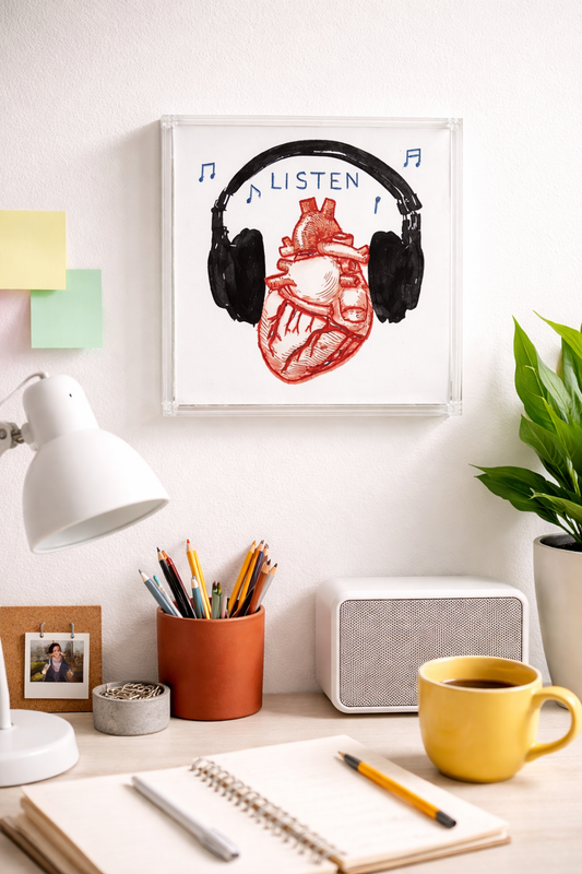 Preço normal R$ 850,00Preço normalPreço unitário / porR$ 850,00Preço promocional R$ 850,00Essa obra em acrílico apresenta a ilustração de um coração anatômico, envolvido por um fone de ouvido, criando uma imagem forte e sensível ao mesmo tempo. O destaque está no bordado à mão aplicado sobre o coração, que acrescenta textura, profundidade e um caráter artesanal à composição. A palavra “Listen” e as pequenas notas musicais reforçam a ideia de escuta, emoção e conexão, convidando à reflexão sobre sentir, ouvir e se permitir. O contraste entre o desenho gráfico, o bordado manual e a transparência do acrílico cria um diálogo contemporâneo entre arte, música e afeto. Com estética moderna e poética, esta peça é ideal para ambientes criativos, trazendo personalidade, sensibilidade e um toque conceitual ao espaço. Tamanho:20x20 Artista: Patricia Saraiva As fotos dos produtos podem ter pequenas variações de cor comparadas ao produto original. Código:161025 -