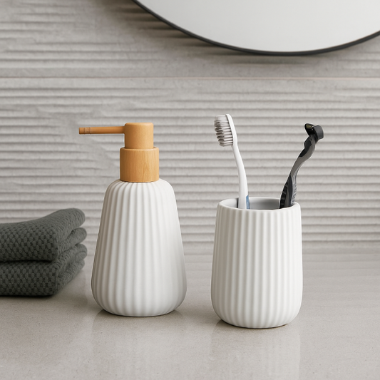 Preço normal R$ 79,00Preço normalPreço unitário / porR$ 79,00Preço promocional R$ 79,00Conjunto de dispenser e porta-escovas em cerâmica texturizada com detalhes em madeira. Une funcionalidade e estilo para deixar seu banheiro mais organizado e sofisticado. Cor: Branco Material: Cerâmica Medidas Aproximadas: 11 x 7 x 7cm | 17 x 8 x 8cm As fotos dos produtos podem ter pequenas variações de cor comparadas ao produto original. Código: DPB02101Esgotado -
