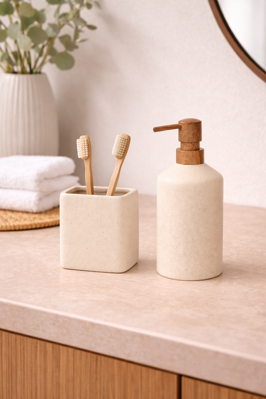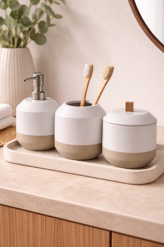 Preço normal R$ 255,00Preço normalPreço unitário / porR$ 255,00Preço promocional R$ 255,00Deixe seu banheiro mais organizado e elegante com este kit de acessórios para banheiro em cerâmica, que combina design moderno e cores neutras, perfeitas para qualquer estilo de decoração. O conjunto inclui: 1 porta-sabonete líquido com válvula pump em acabamento metálico, 1 porta-escovas multiuso, ideal também para organizar pequenos itens, 1 pote com tampa, perfeito para armazenar algodão, cotonetes ou acessórios. Com acabamento sofisticado em branco e bege, o kit traz um visual clean e aconchegante, além de ser funcional para o dia a dia. Ideal para quem busca praticidade sem abrir mão do bom gosto. As fotos dos produtos podem ter pequenas variações de cor comparadas ao produto original. Código:21765 -