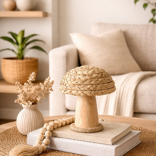 Preço normal R$ 89,00Preço normalPreço unitário / porR$ 89,00Preço promocional R$ 89,00Cogumelo Decorativo em Palha Natural com Base em Madeira Objeto decorativo confeccionado em palha natural trançada, com base em madeira, que une acabamento artesanal e design inspirado na natureza. O formato de cogumelo e a textura da palha conferem charme e originalidade à peça, enquanto a base em madeira traz estabilidade e um toque acolhedor. Versátil, é ideal para compor aparadores, prateleiras, mesas e nichos, harmonizando com ambientes de estilo natural, boho e rústico. Medidas aproximadas:Largura: 12 cmProfundidade: 12 cmAltura: 15 cm As fotos dos produtos podem ter pequenas variações de cor comparadas ao produto original. Código:84211001 -