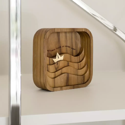Preço normal R$ 185,00Preço normalPreço unitário / porR$ 185,00Preço promocional R$ 185,00Nesta peça, as ondas esculpidas em madeira expressam o movimento da vida, com suas marés e calmarias. O pequeno barco em latão, símbolo de esperança e união, recorda que — em essência — estamos todos no mesmo barco. Medidas: 12x12x3,5cm Acompanha fecho de contato (Velcro) adesivo para ser pendurado na parede. As fotos dos produtos podem ter pequenas variações de cor comparadas ao produto original. Código: 030621Esgotado -