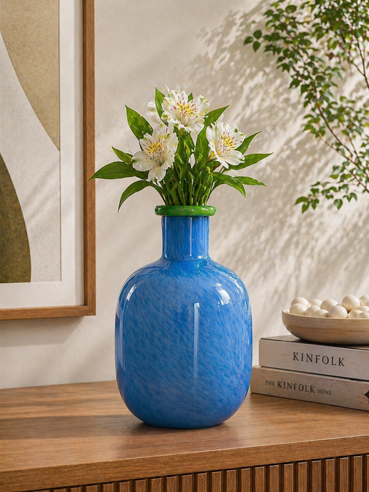 Preço normal R$ 399,00Preço normalPreço unitário / porR$ 399,00Preço promocional R$ 399,00Vaso Decorativo em Vidro Azul Vaso decorativo em vidro, ideal para compor ambientes com estilo e personalidade. A peça apresenta design contemporâneo com acabamento em tom azul translúcido e leve efeito marmorizado, proporcionando um visual sofisticado e moderno. O detalhe em anel verde no gargalo adiciona um toque de contraste elegante, tornando o vaso ainda mais exclusivo. Perfeito para uso com flores naturais ou artificiais, é uma peça versátil que valoriza aparadores, mesas, estantes e nichos decorativos, trazendo cor e leveza ao ambiente. Seu acabamento brilhante e formato equilibrado fazem deste vaso uma excelente escolha para diferentes estilos de decoração. Medidas: Altura 28 cm x Comprimento 14 cm x Largura 14 cm (aprox.) Cor: Azul com detalhe verde Material: Vidro As fotos dos produtos podem ter pequenas variações de cor comparadas ao produto original. Código: 73938 -