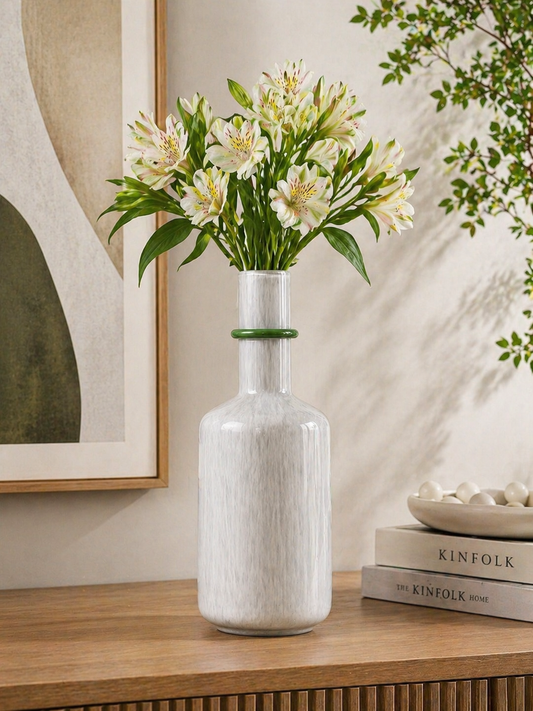 Preço normal R$ 489,00Preço normalPreço unitário / porR$ 489,00Preço promocional R$ 489,00Vaso decorativo em vidro com design elegante e contemporâneo. Possui formato alongado, com base levemente arredondada e gargalo estreito, valorizando a composição de ambientes modernos e sofisticados. Seu acabamento em tom branco leitoso com textura suave confere um visual delicado e versátil, fácil de combinar com diferentes estilos de decoração. O destaque fica por conta do detalhe em anel de vidro verde no gargalo, que adiciona um toque de cor e personalidade à peça. Com linhas simples e acabamento brilhante, é perfeita para decorar aparadores, estantes, mesas ou nichos, harmonizando facilmente com diversos estilos de decoração, do contemporâneo ao clássico. Uma peça versátil e atemporal que agrega leveza e charme ao ambiente. Medidas: 36 x 11 x 11 cm (aprox.) Cor: Cinza com detalhe verde Material: Vidro As fotos dos produtos podem ter pequenas variações de cor comparadas ao produto original. Código: 73937 -