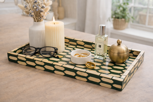 Preço normal R$ 315,00Preço normalPreço unitário / porR$ 315,00Preço promocional R$ 315,00Bandeja Decorativa de Bambu com Estampa Geométrica Esta bandeja decorativa em bambu possui estampa geométrica em tons de verde e natural, ideal para compor a decoração com charme e personalidade. Versátil, pode ser utilizada para organizar objetos, apoiar velas, perfumes ou criar composições decorativas em diversos ambientes da casa. Uma peça que une funcionalidade e estilo, perfeita para valorizar mesas, aparadores e bancadas. Material: Bambu Medidas aproximadas: 30,5 × 15 × 2,5 cm As cores e acabamentos podem apresentar pequenas variações em relação às imagem As fotos dos produtos podem ter pequenas variações de cor comparadas ao produto original. Código:79420 -