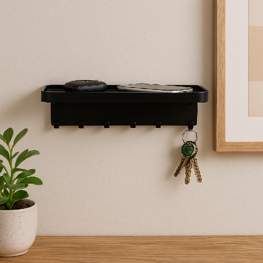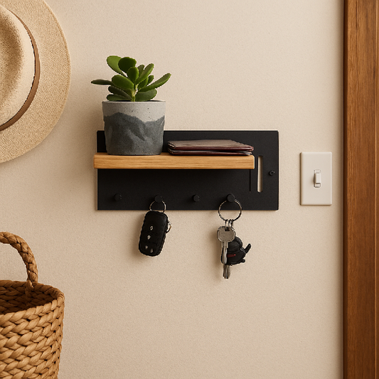 Preço normal R$ 229,00Preço normalPreço unitário / porR$ 229,00Preço promocional R$ 229,00Porta-chaves moema na cor pretotrazem o urbano para dentro de sua casa. Seu design moderno e suas cores facilitam as combinações com diversos ambientes, ideal para unir criatividade e praticidade. Minimalista e compacta, possui quatro divisões para chave e prateleira em madeira. DIMENSÕES: C: 28 cm x A: 13 cm x P: 10 cm; Prateleira - 20 cm x 10 cm. ESPECIFICAÇÕES: Material em aço carbono; Pintura eletrostática a pó (tinta poliéster e microtextura), maior durabilidade e qualidade; Prateleira em madeira maciça com acabamento em seladora; Acompanha kit instalação buchas 6mm e parafusos. OUTRAS INFORMAÇÕES: Produto vem desmontado, montagem rápida e fácil; *Instalação não inclusa; Os objetos que ambientam as fotos não acompanham o produto; Para limpeza, não utilizar produtos químicos e abrasivos; Utilizar pano levemente umedecido para garantir maior durabilidade do produto. As fotos dos produtos podem ter pequenas variações de cor comparadas ao produto original. Código: ED100Esgotado