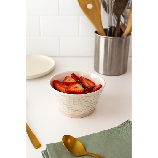 Preço normal R$ 35,00Preço normalPreço unitário / porR$ 45,00Preço promocional R$ 35,00Bowl de cerâmica com acabamento esmaltado e textura em relevo. Ideal para servir sopas, saladas, frutas ou compor uma mesa posta charmosa. Design rústico e elegante, combina com qualquer estilo de decoração. Material: Cerâmica Cor: Off whate com detalhes bege Medidas aproximadas : 8x 13cm As fotos dos produtos podem ter pequenas variações de cor comparadas ao produto original. Código: DPU06243Esgotado
