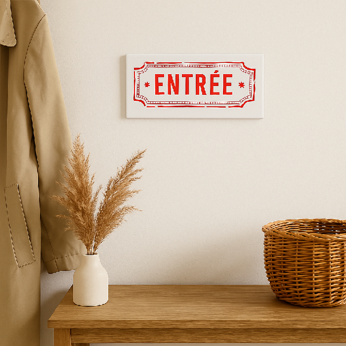 Este com a frase "Entrée" (Entrada) para decorar o hall de entrada ou algum ambiente convidativo da casa, do trabalho...