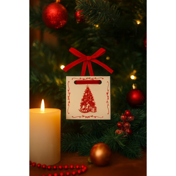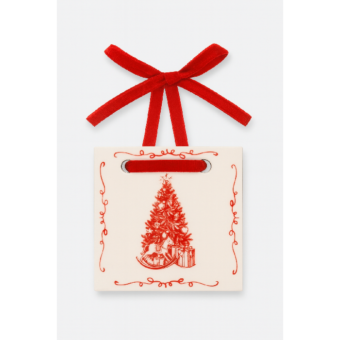 Encante sua decoração natalina com este delicado azulejo em cerâmica, com estampa vermelha de árvore de Natal e um lindo laço de veludo vermelho. Um toque clássico e charmoso para pendurar em sua casa ou presentear com estilo.