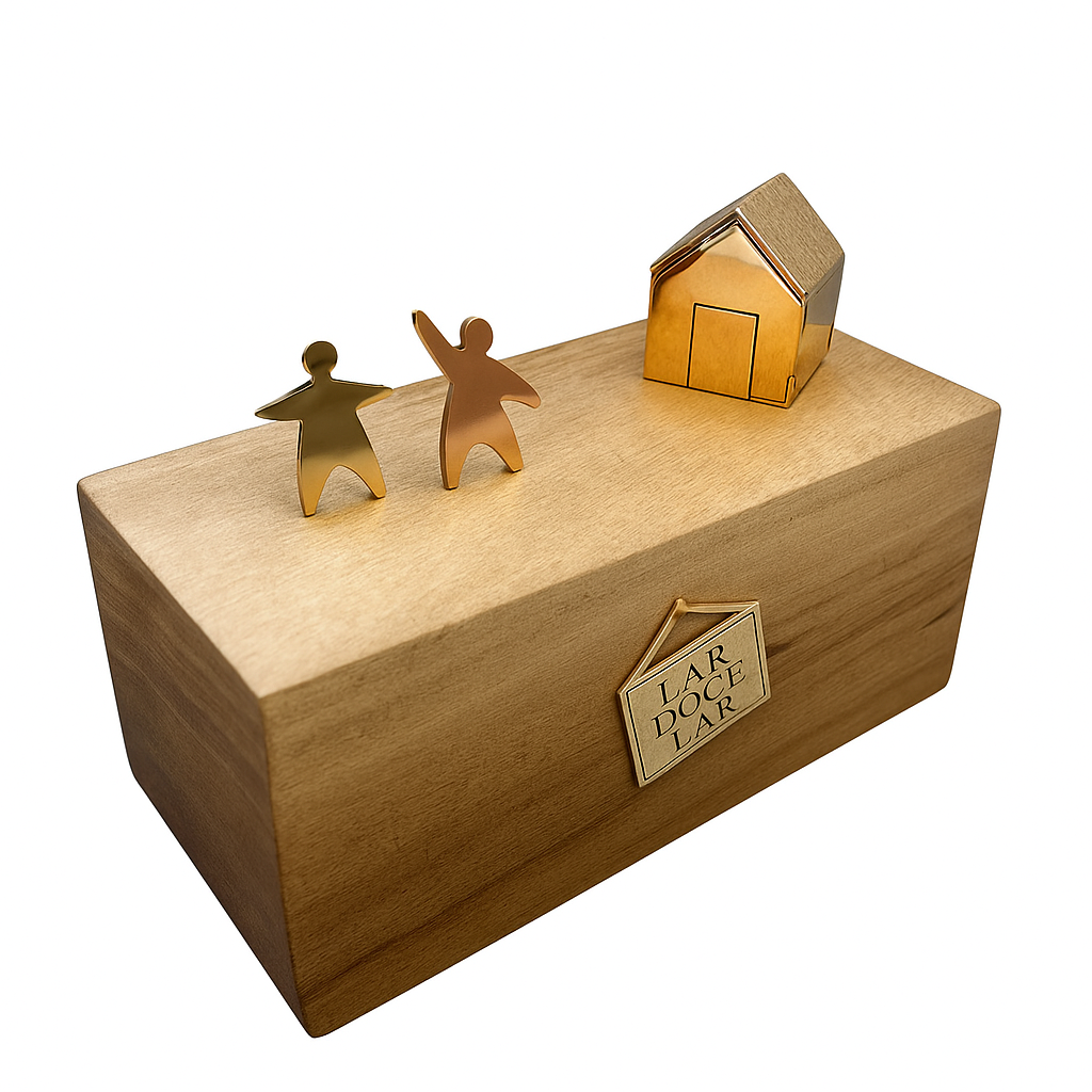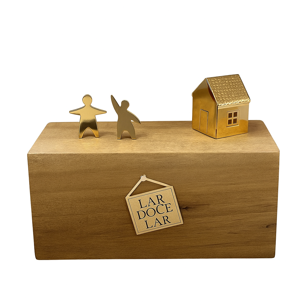 O Bloco Lar Doce Lar Nós é feito em madeira natural com detalhes metálicos dourados, representando um casal e uma casinha — um toque de afeto e aconchego para qualquer ambiente.