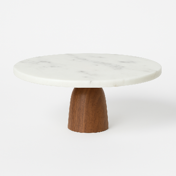 Suporte para Bolo de Mármore e Madeira combina a sofisticação do mármore com o charme natural da madeira, criando uma peça única para compor sua mesa. O tampo em mármore branco com veios sutis traz um toque moderno e refinado, enquanto a base em madeira maciça oferece estabilidade e um contraste acolhedor.