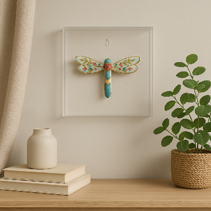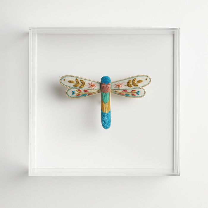 Libélula bordada a mão pelos artistas As Meninas com efeito 3D em tecido de algodão cru com enchimento . Fundo em tecido cru com detalhes em fio colorido, dourado e miçangas.