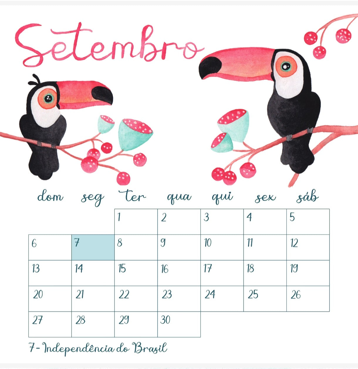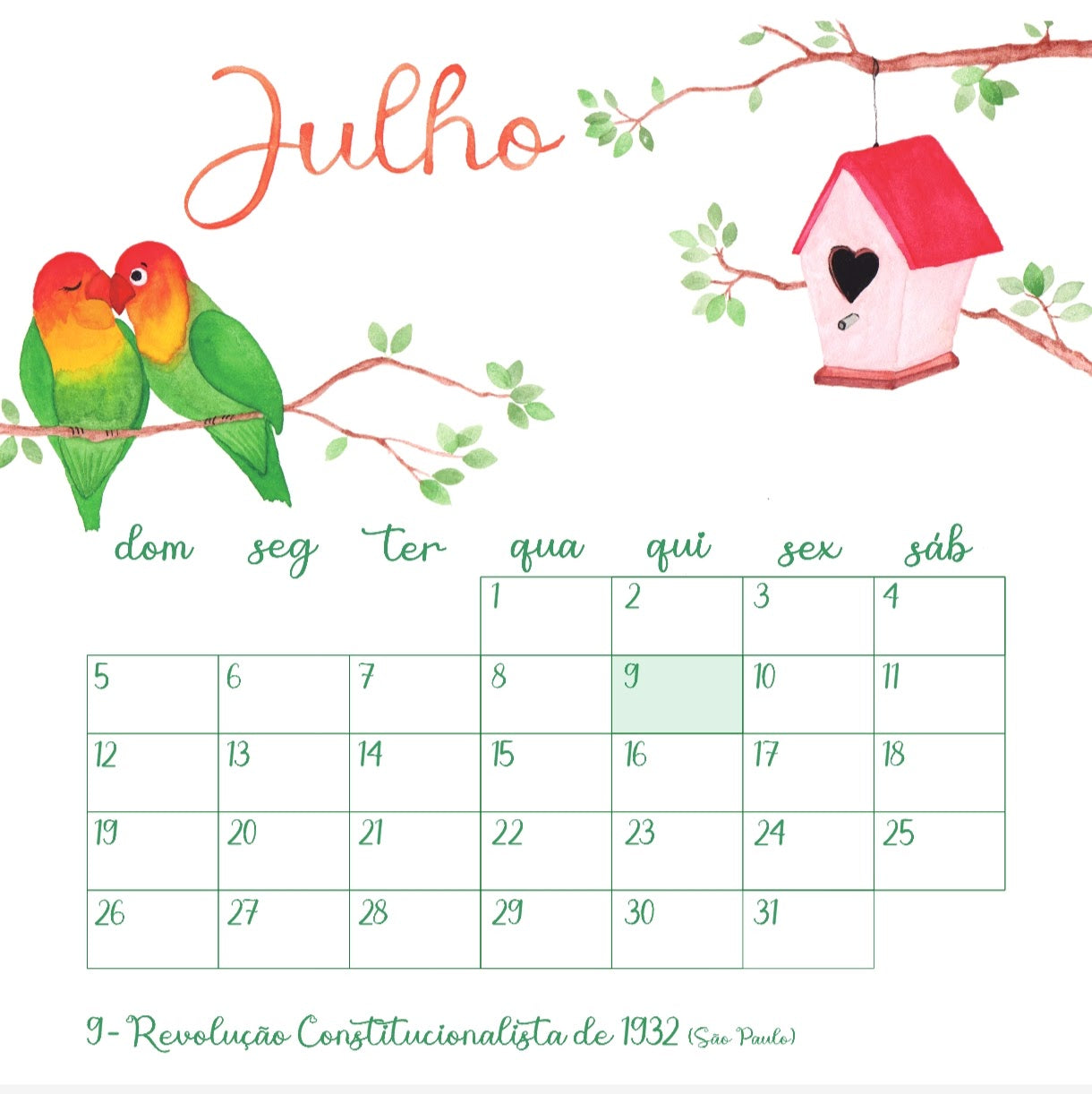 Calendário Pássaro 2026 de parede com 13 páginas de 30x30 impressas em papel couchê a partir de aquarelas originais.