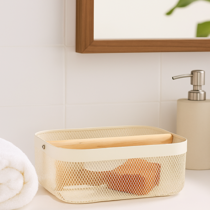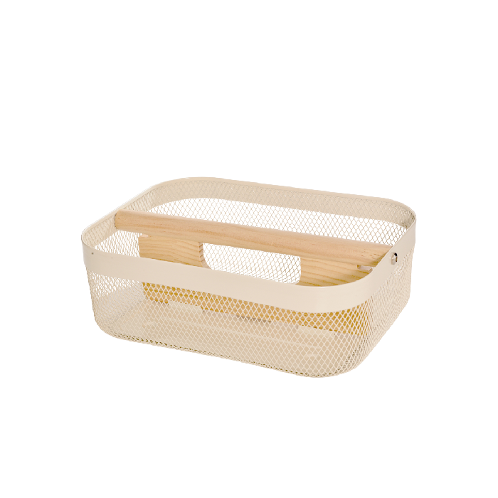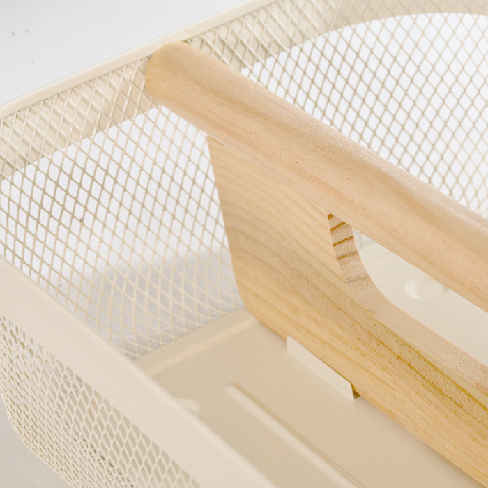 Cesta em metal telado com alça de madeira, prática e versátil.