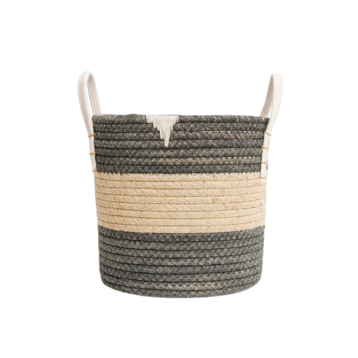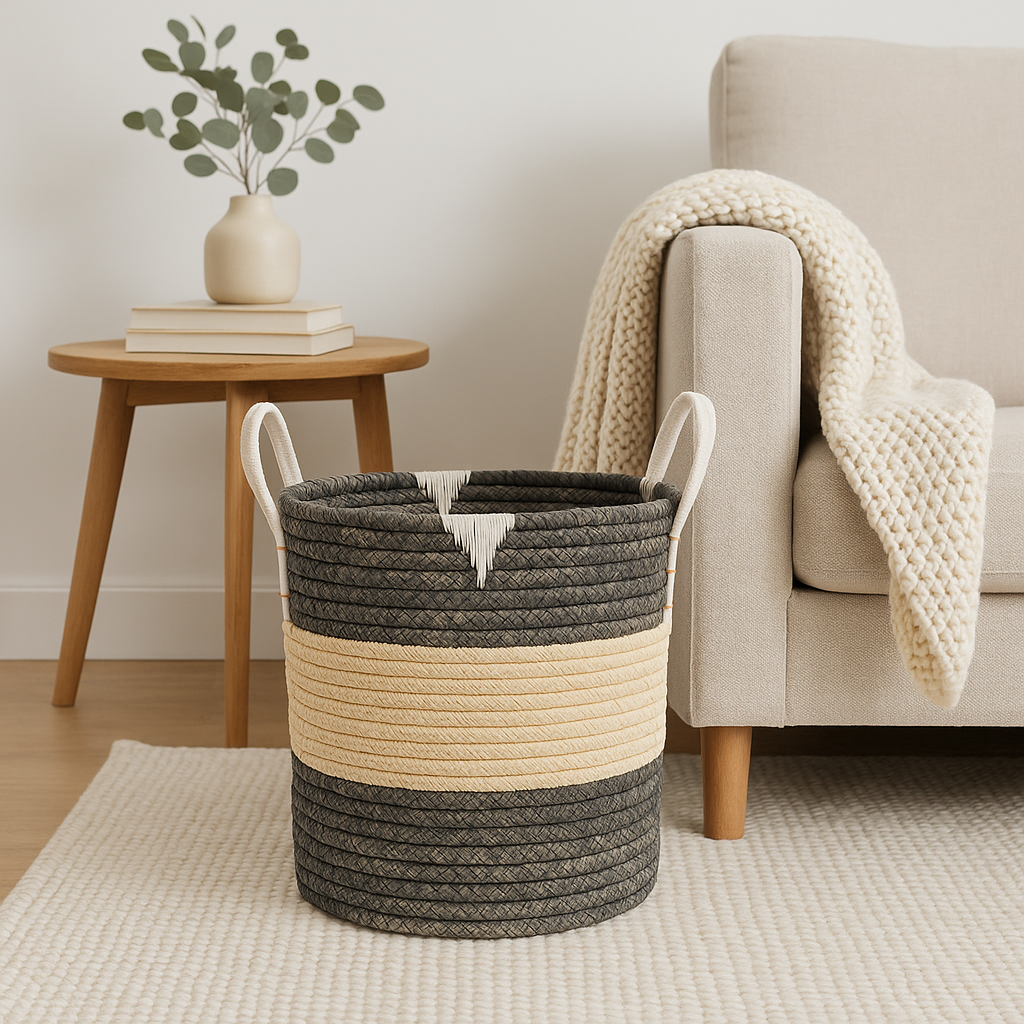 O cesto de palha é feito com cordas trançadas em tons terrosos e neutros, ele traz um charme natural à decoração, sendo perfeito para salas, quartos, banheiros ou áreas de lavanderia.