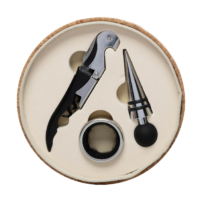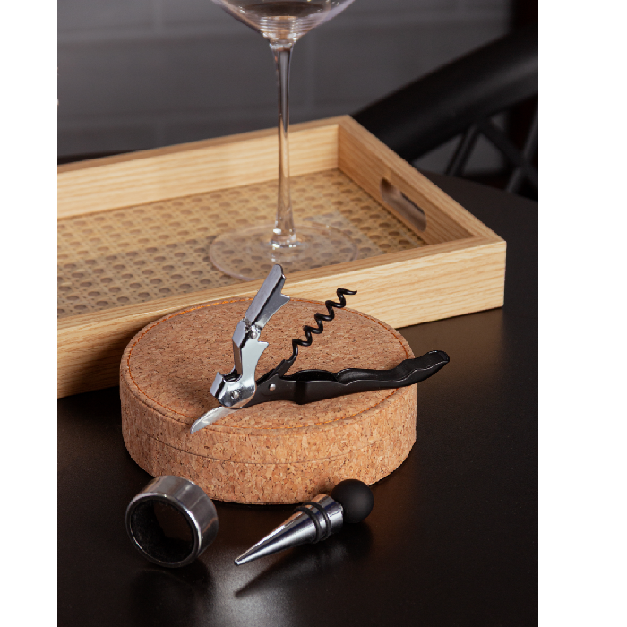 Conjunto Bordeaux e elegante e prático, o conjunto inclui saca-rolhas, bico dosador e anel corta-gotas.