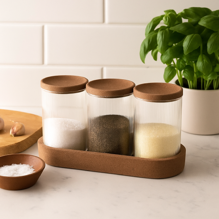 Conjunto de 3 potes de vidro borossilicato com tampa rolha e bandeja de cortiça. Fica lindo para organizar coisas no banheiro ou para guardar alimentos com muito charme.
