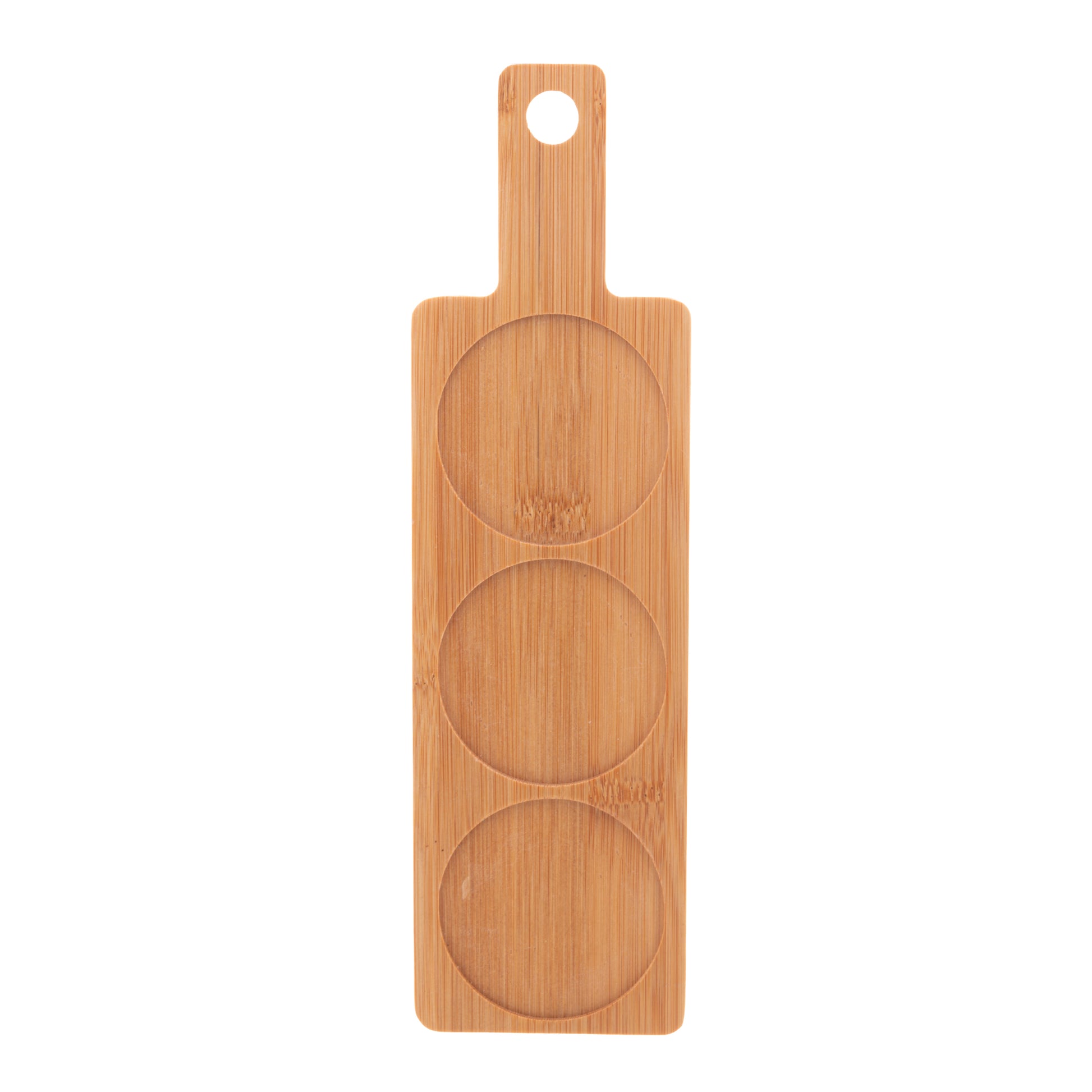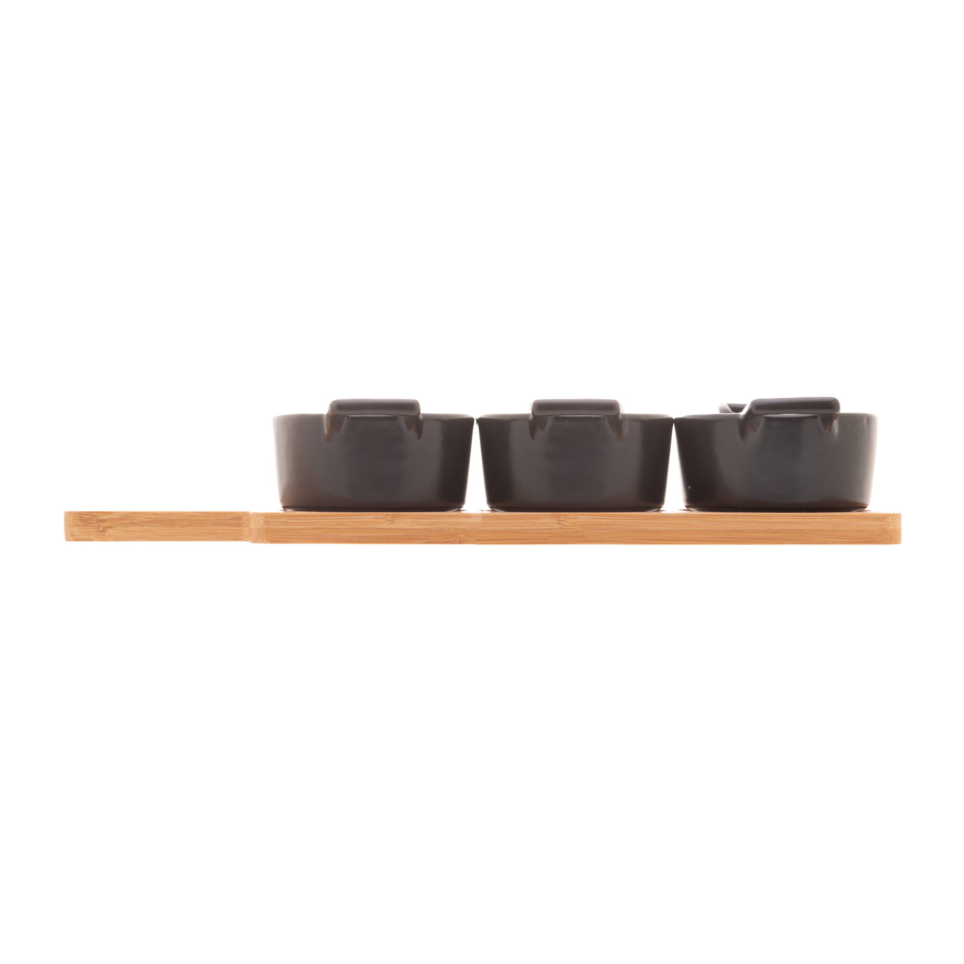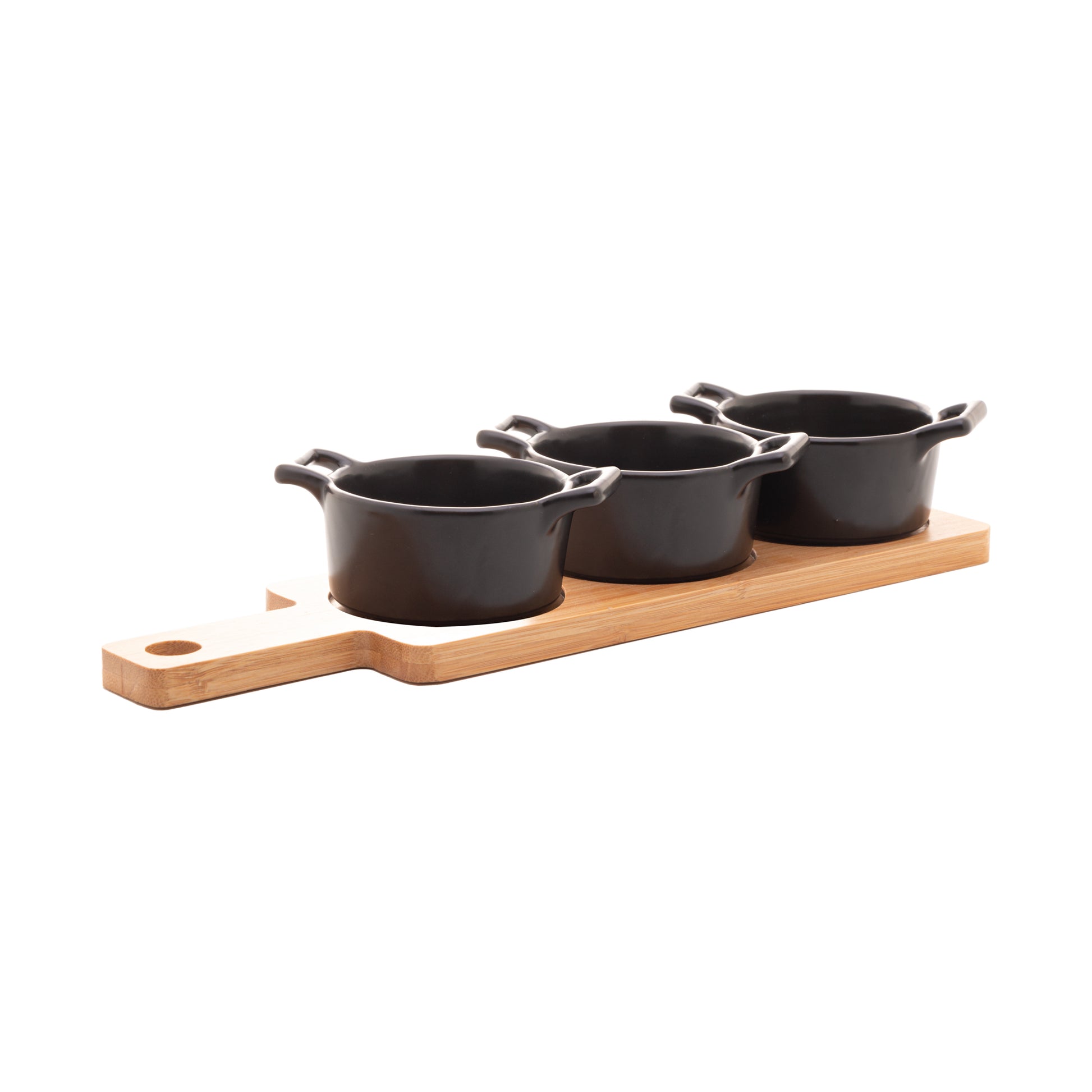 Adicione praticidade e elegância à sua mesa com este conjunto de bandeja de bambu acompanhado por três petisqueiras redondas na cor preta. Perfeito para servir aperitivos, molhos, frutas ou pequenas porções com estilo e organização.