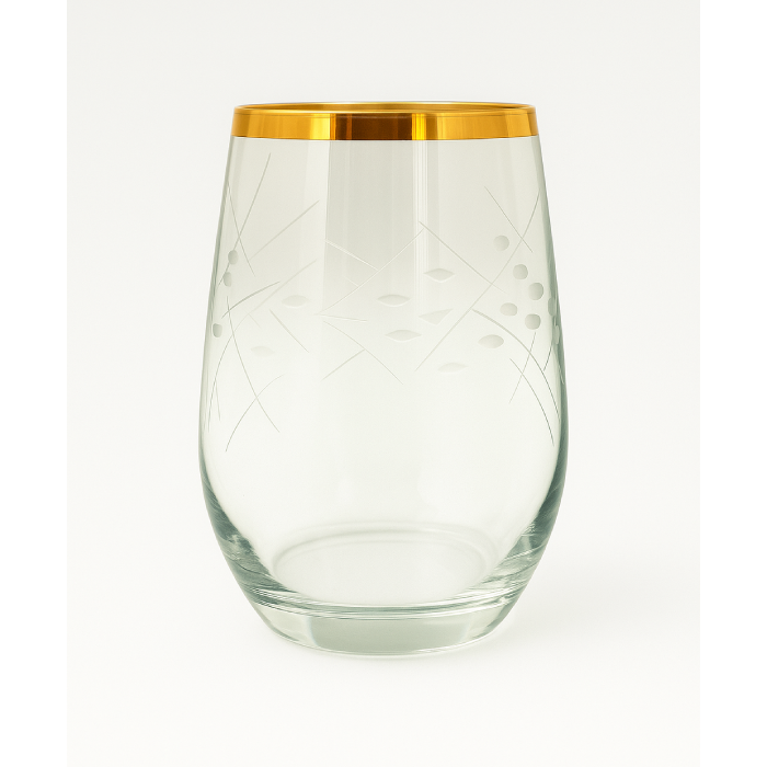 Copo de Vidro, lapidado à mão com filete ouro, para servir bebidas, um suco um coquetel, água aromatizada... e o vinho (taça sem haste) e decorar a mesa.