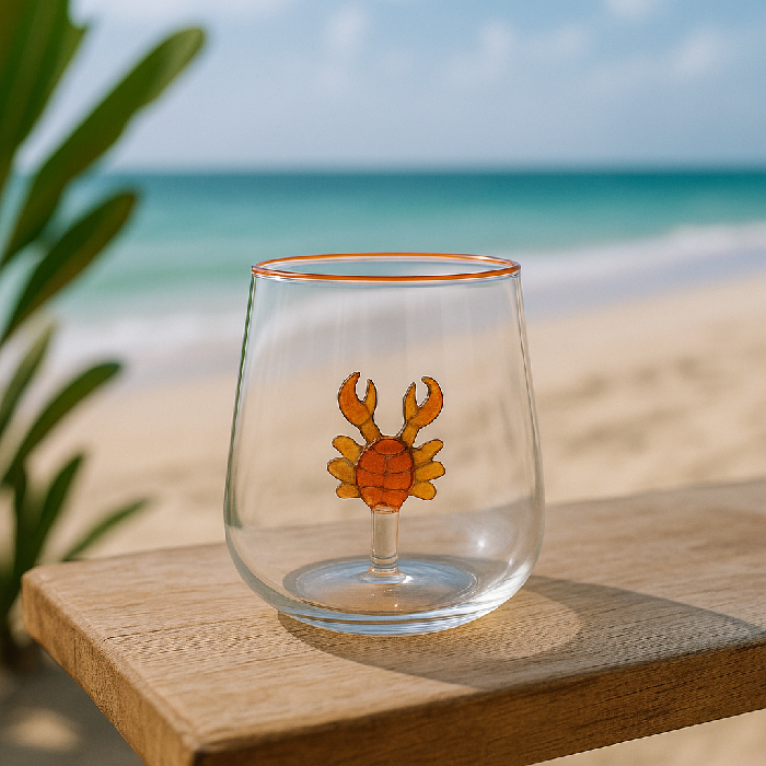 Este copo de vidro conta com um caranguejo decorativo no interior, feito em vidro, trazendo um toque divertido e artesanal à sua mesa.