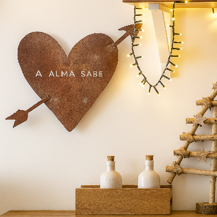 Coração em ferro envelhecido com a frase "A alma sabe". Vem com afastadores soldados para deixar a peça mais afastada, criando uma linda sombra na parede.