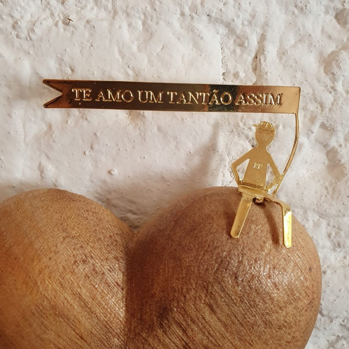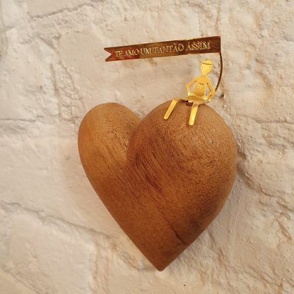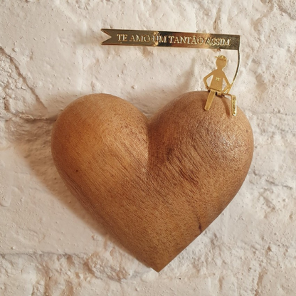 Coração Menino com a frase Te amo um tantão assim. Feito de Madeira com variação de cor e pequenas imperfeições naturais, metal com banho de ouro 18k