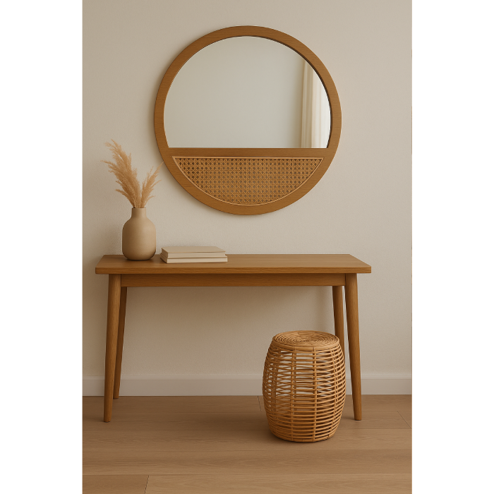 Decore seu ambiente com charme e elegância! Este espelho redondo combina madeira natural e detalhe em rattan, criando um visual rústico e sofisticado ao mesmo tempo. Ideal para salas, quartos, halls de entrada ou qualquer espaço que merece um toque especial.