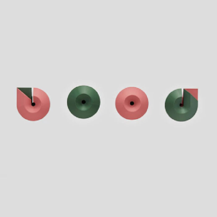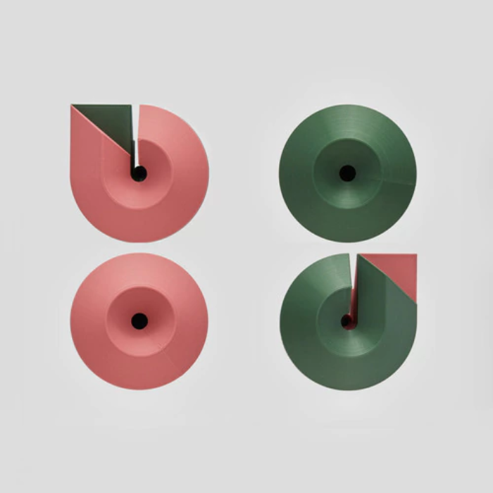 Com dois formatos diferentes, o kit permite composições criativas e cheias de personalidade. Cada peça combina verde bosque e terracota rosada, unindo curvas suaves e linhas geométricas em um design moderno e minimalista.