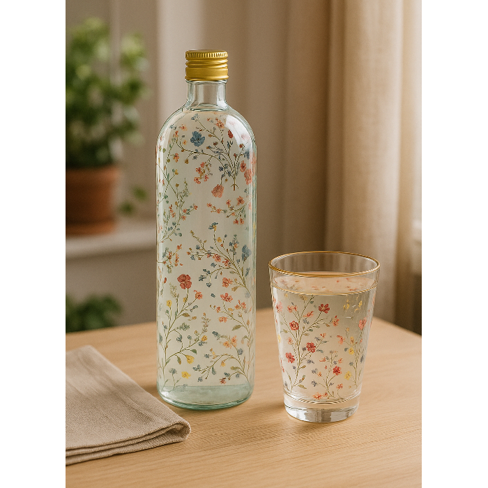 Garrafa de Vidro linda com tampa de alumínio dourada, estampa floral.