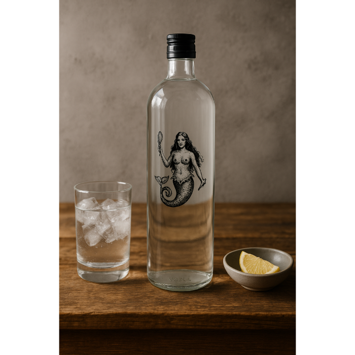 Garrafa de Vidro 750 ml com tampa de alumínio preta e estampa preta.