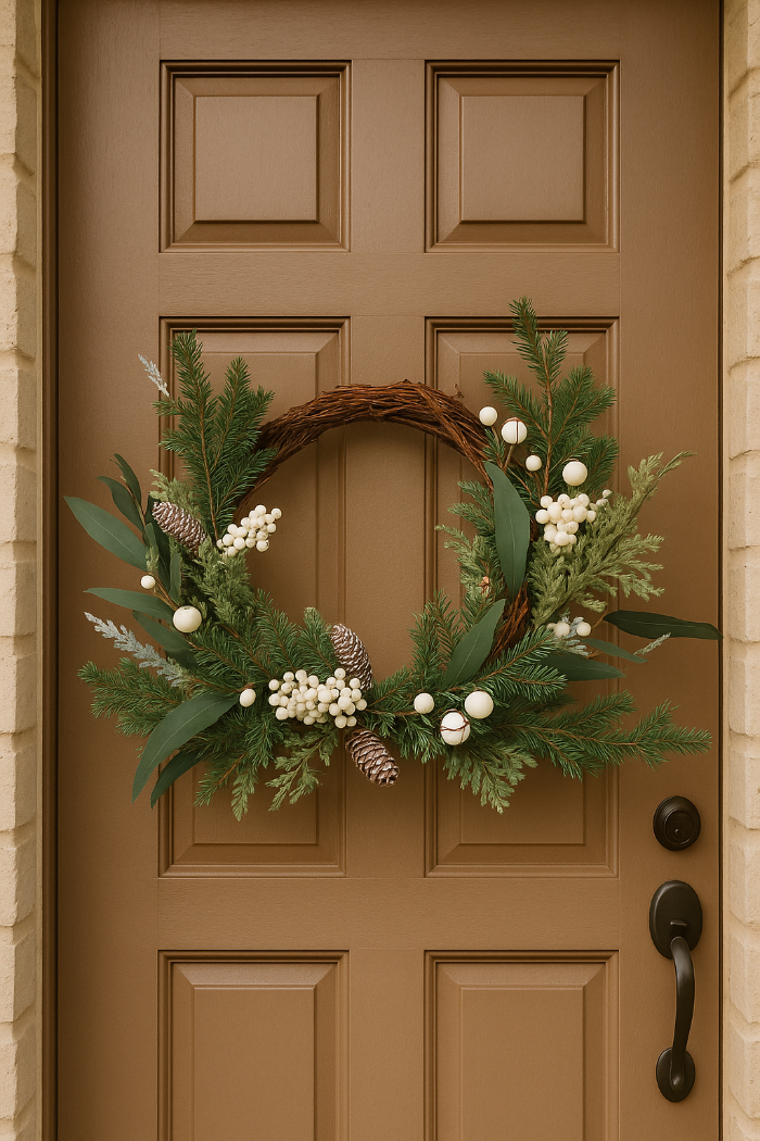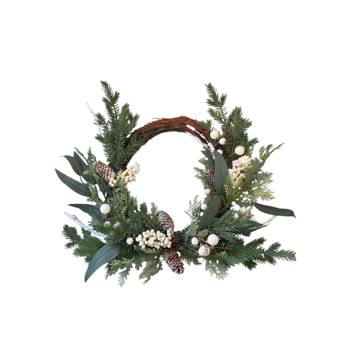 Com design delicado e toque rústico, ela combina galhos verdes, folhas de eucalipto, pinhas e frutinhas brancas que remetem à leveza do inverno e à elegância das festas natalinas.