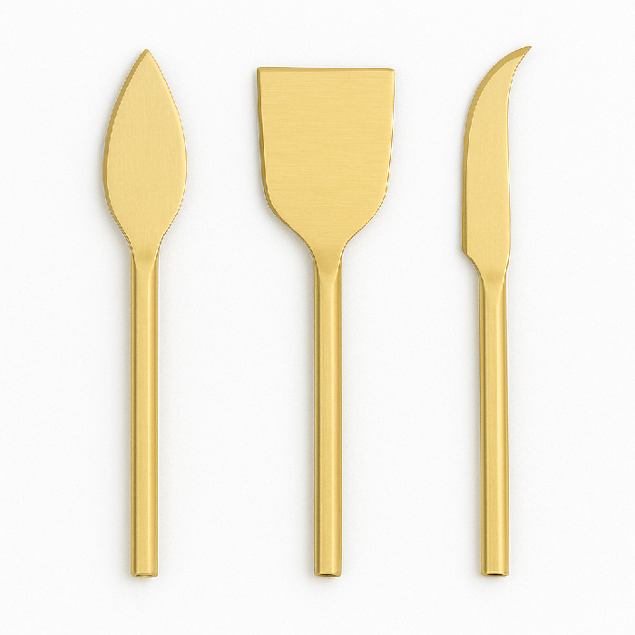 O Kit de Espátulas para Queijo em Aço Inox Dourado é a escolha perfeita para quem busca sofisticação e praticidade. Composto por 3 peças em aço inox, o conjunto apresenta um design elegante e moderno, destacando-se pela tonalidade dourada que confere um toque de glamour à sua cozinha. Ideal para servir queijos de forma refinada e charmosa, este kit é indispensável para os amantes da gastronomia. Adicione um toque de requinte às suas refeições.