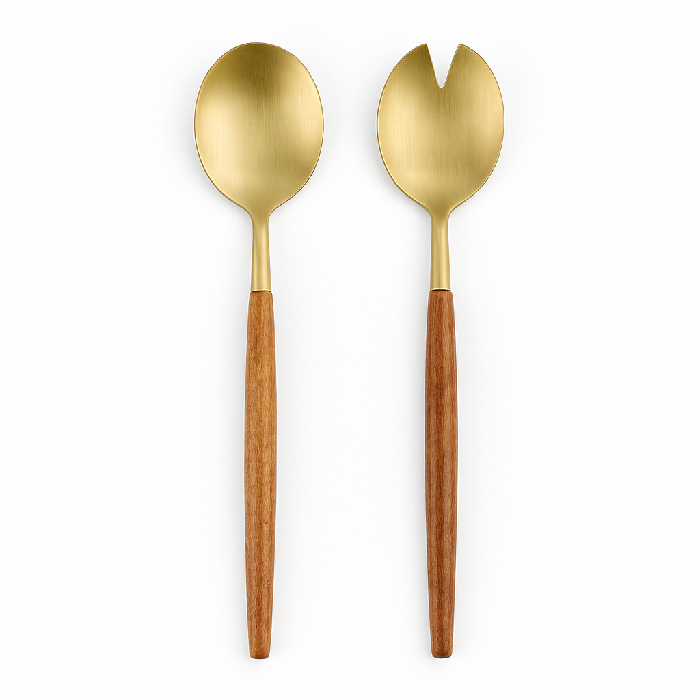 Kit de Talheres da coleção Atmosfera é a combinação perfeita de elegância e sofisticação para a sua mesa. Com cabo em madeira e lâminas em aço inox dourado, este conjunto de 2 peças traz um toque de requinte e modernidade para suas refeições. A tonalidade dourada adiciona um brilho especial, tornando cada momento à mesa ainda mais especial