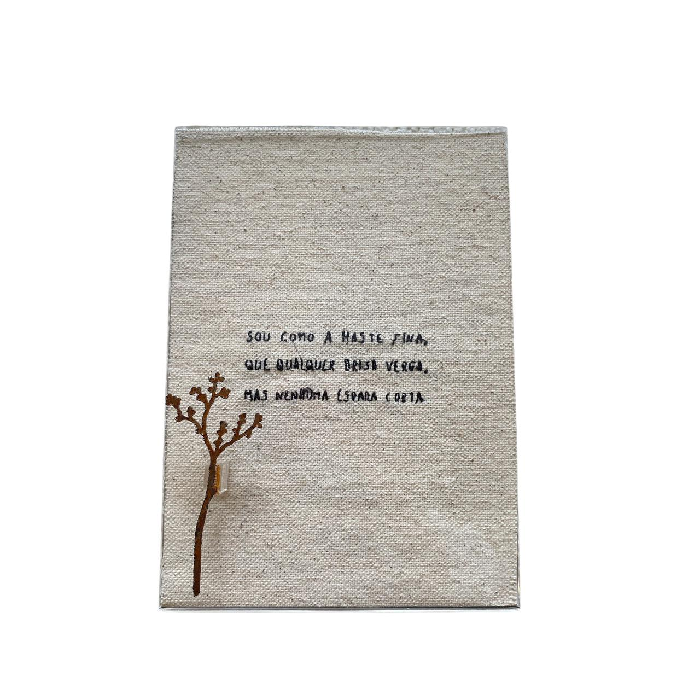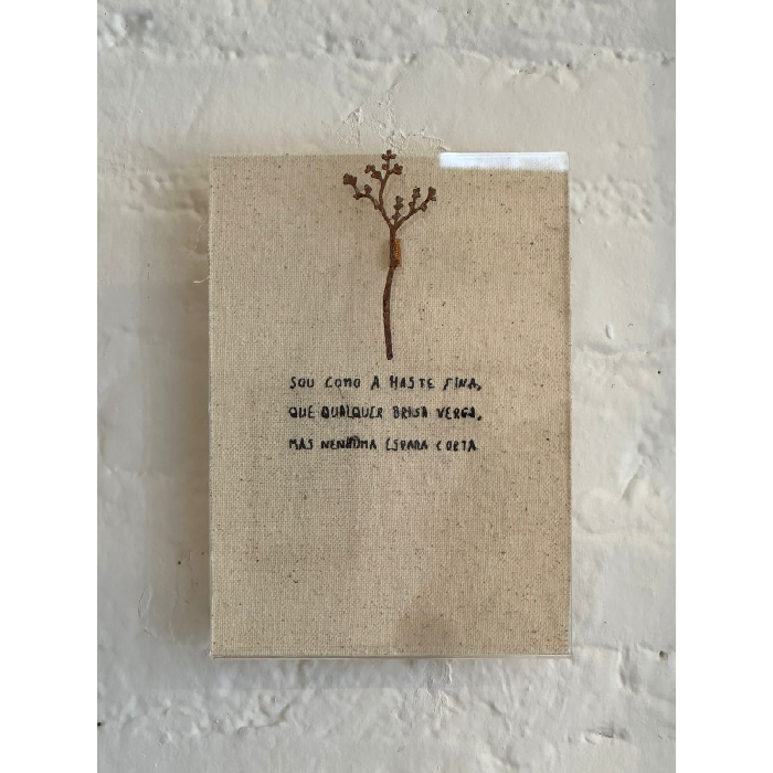 Bordado à mão sobre tecido cru, com haste em ferro envelhecido que parece flutuar — símbolo de resiliência e leveza diante da vida.