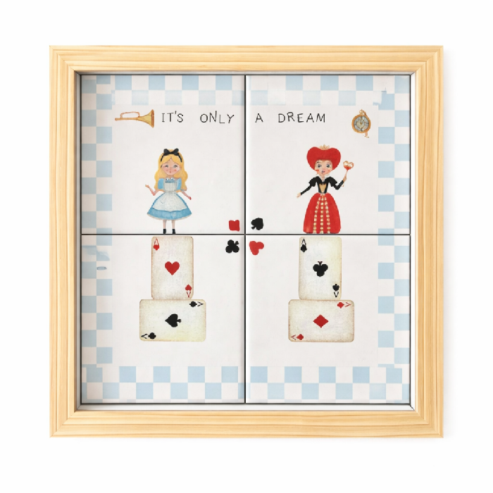 Encante sua decoração com o Quadro de Azulejos Alice, inspirado no universo mágico de Alice no País das Maravilhas. Com ilustração delicada e cores suaves, a peça traz um toque lúdico e criativo para qualquer ambiente. Produzido com quatro azulejos que formam uma arte única e emoldurado em madeira clara, é perfeito para decorar salas, quartos, espaços infantis ou cantinhos especiais da casa.