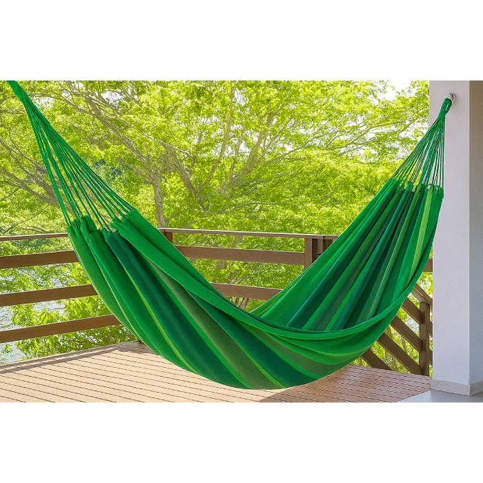 A rede de dormir Tambaú tem listras harmônicas, com cores vivas que se complementam.