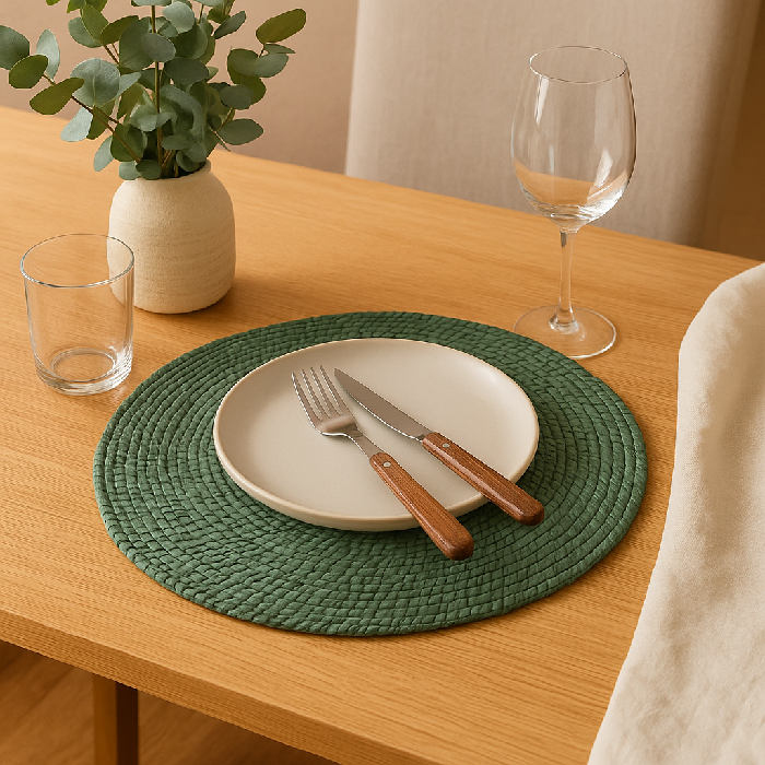 O Sousplat é feito com fibra natural turquesa, oferecendo elegância e sustentabilidade. Seu material resistente é perfeito para proteger mesas e oferecer um toque sofisticado à decoração de qualquer refeição. Adicione o nosso sousplat à sua coleção de jantar e desfrute de uma experiência prazerosa e consciente.