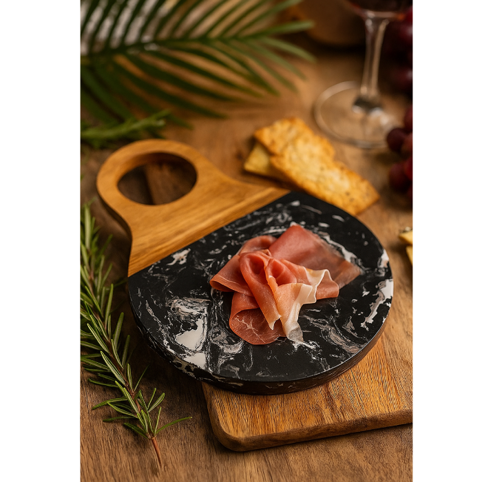 Tábua com formato circular com madeira e mármore, ideal para servir aperitivos e de quebra decorar a cozinha ou churrasqueira com muito estilo.