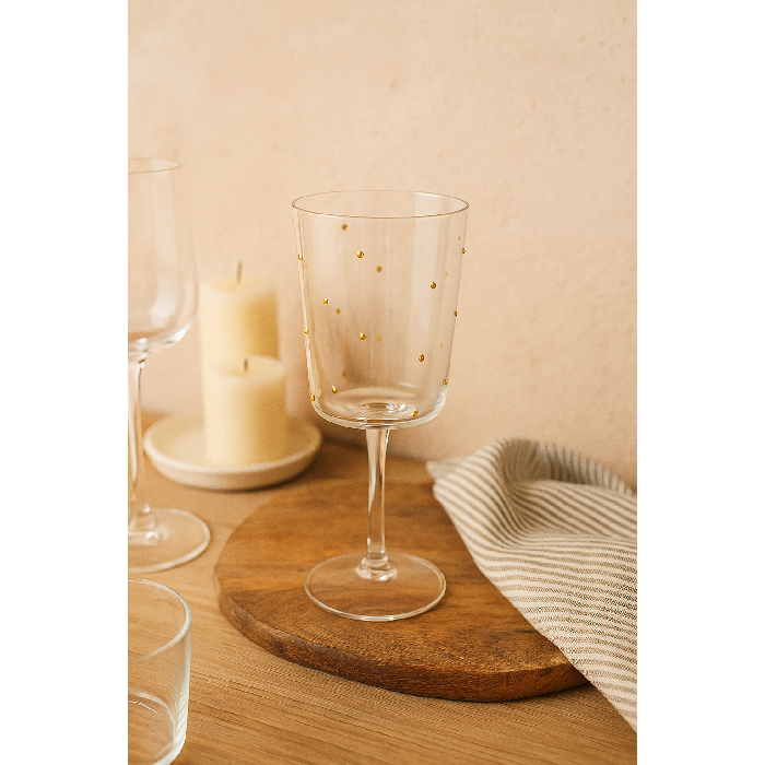 A Taça em Vidro Transparente com Pontos Dourados traz um toque de elegância e sofisticação à sua mesa. Com design delicado e detalhes em dourado, é perfeita para servir bebidas com charme em ocasiões especiais ou no dia a dia.