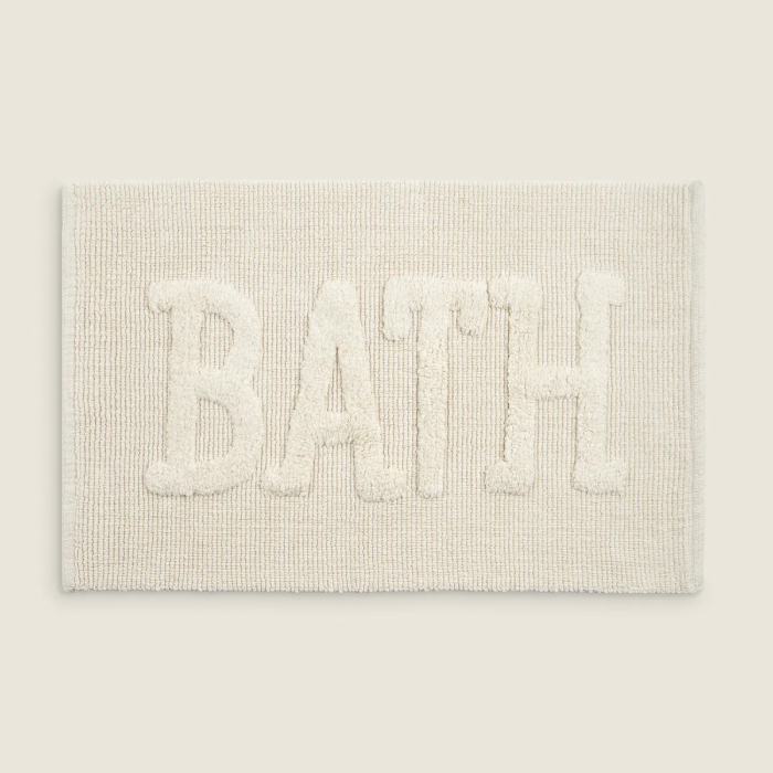 Eleve a decoração do seu banheiro com o Tapete Bath, feito em algodão com design em alto relevo que destaca a palavra "BATH". Em cor natural e tons neutros, combina elegância e funcionalidade.