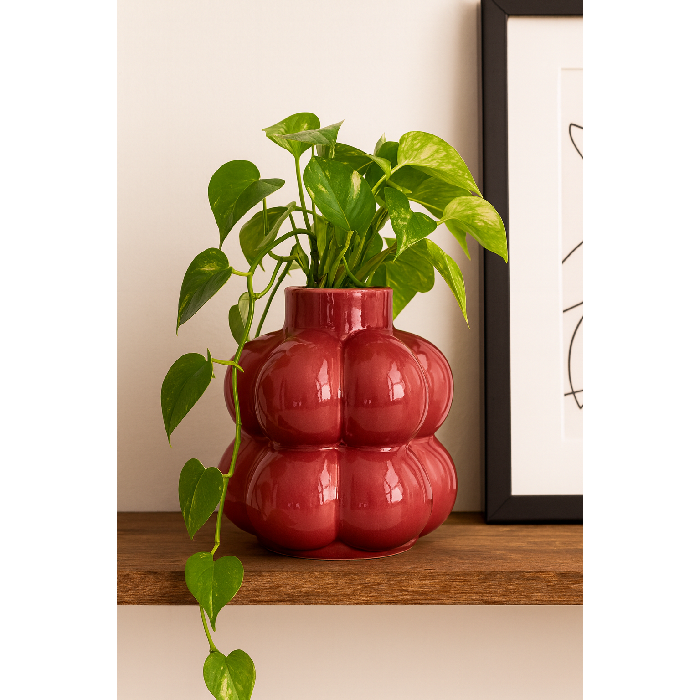 Com design moderno e acabamento em cerâmica esmaltada, o vaso bordô traz sofisticação e personalidade à decoração. Sua forma orgânica e brilho elegante o tornam perfeito para compor ambientes contemporâneos, seja com flores, folhagens ou como peça decorativa.